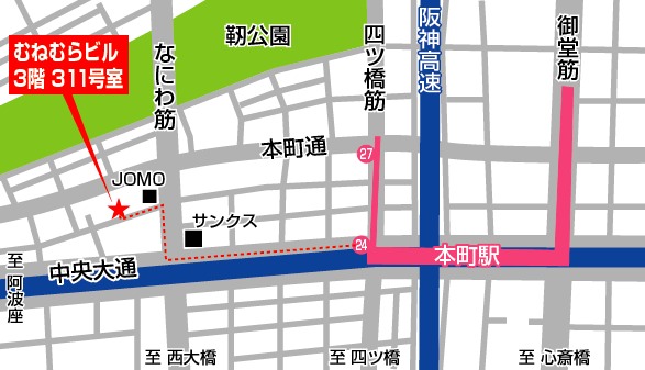 大阪市営地下鉄「本町駅」24番出口(四つ橋線側の出口)より中央大通沿いに西へ5分、